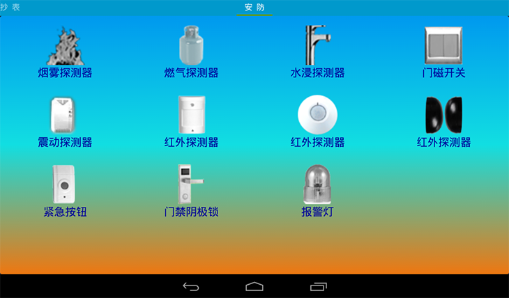 4、家居安防环境监测系统:通过红外入侵、震动、燃气、烟雾、水浸、紧急按钮、红外对射入侵检测、门禁一体机、门锁、门磁、报警灯等工业级传感器,配合智能网关家居安防系统软件,实现智能家居安防系统,使学生们可以真正的了解与学习物联网无线传感网技术在智能家居上的应用。