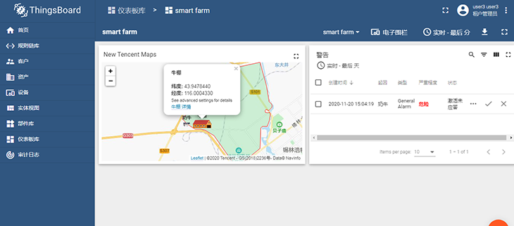 图:智慧牧场课程案例,使用GPS对奶牛位置进行定位,通过LoRa网络将位置信息上报,使用ThingsBoard平台的电子围栏工具结合腾讯地图,实现奶牛越过电子围栏时发送警报提醒。