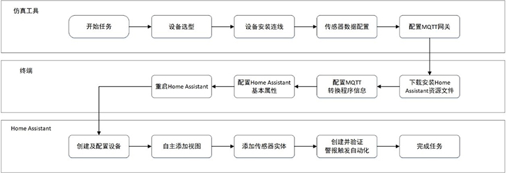 图:智能家居课程案例,使用自动化智能家居平台Home Assistant,对安装好的感知层设备进行数据的浏览和各种自动或手动的执行操作。
