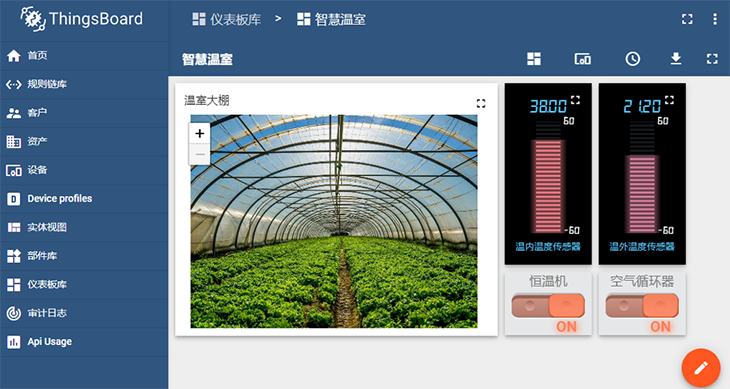 图:智慧温室课程案例,使用ThingsBoard云平台的仪表板,对感知层设备上送的温室环境数据与设备状态进行展示。