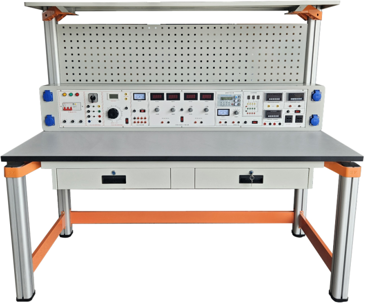 电子技术综合实训装置由实验主机箱、仪器架、实训桌、移动矮柜、实训套件、学生凳等组成。实验装置支架与实验桌可组合、可拆装。支架与桌脚一体,铝合金结构。