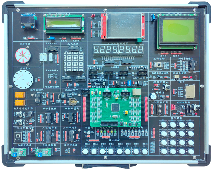 基于ARM嵌入式实训装置,基于STM32系列嵌入式芯片,从嵌入式实验教学的特点出发,基础功能实验电路采用一体化设计方式,创新拓展型实验电路采用独立模块方式,需要时接入主板,既兼顾演示验证性实验、又考虑到综合设计和创新研究性实验的需要。主板上自带CPU编程下载接口,是一款灵活性极强的集编程下载调试与一体的新型嵌入式实验教学平台,适合各层次学生进行嵌入式原理和应用方面的实验和创新。