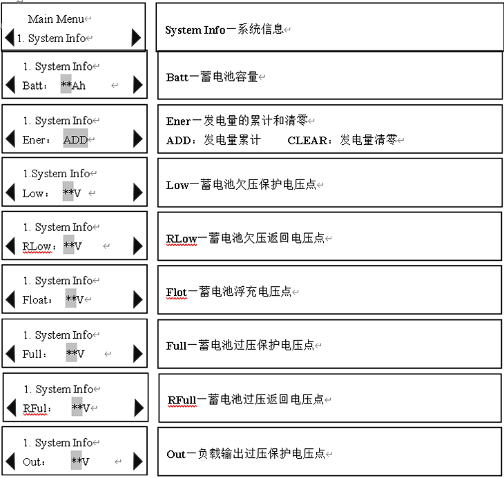 Ø 系统工作状况、蓄电池的剩余电量等的变化;