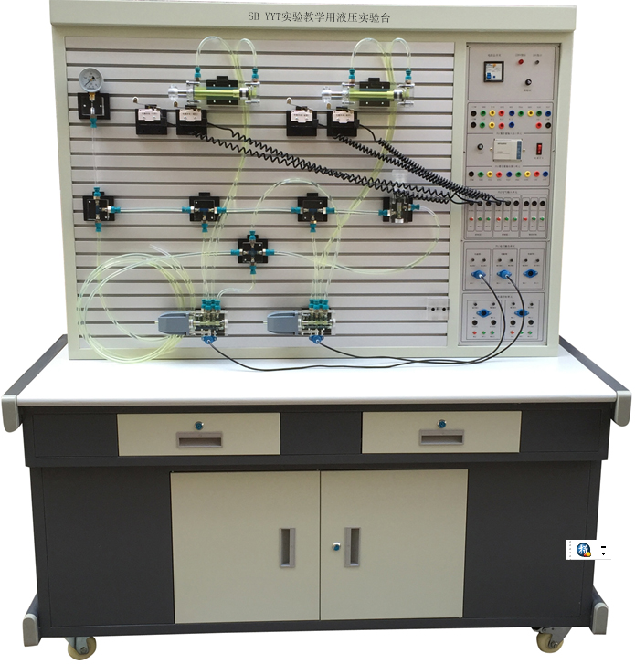 2、实验桌、实验台为铁质双层亚光密纹喷塑结构,实验桌下柜子内可存放液压元件等。