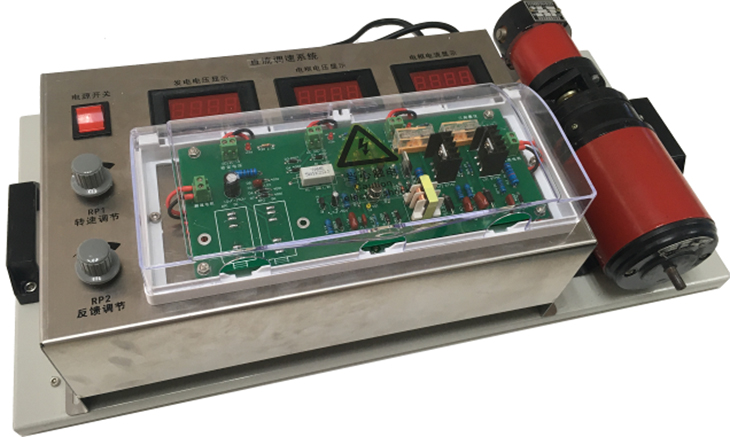 模块底板采用优质Q235冷轧钢板经折弯后焊接而成,表面静电喷塑处理。底板上装有两个黑色铸铝拉手,方便搬运。底板上方有直流电机、测速发电机、直流调速线路板、显示系统等组成。该模块采用测速发电机反馈电压和给定电压形成闭环调速系统,调速系统由给定电压、转速负反馈、放大电路、触发产生电路及主电路组成。学员根据功能要求进行测量分析,完成故障诊断与排除。