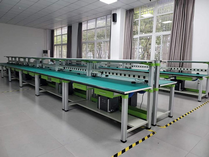 实训桌规格为1600(长)*700(宽)*1300(高),设有一个抽屉;实验桌主体结构全部采用高性能表面氧化的铝型材及一次成型铝压铸框架连接构件,连接构件采用压铸成型工艺(非焊接工艺),经机加工、抛丸、喷砂,表面静电喷涂工艺,安装方便、快捷,用户可自行DIY组装。桌体立柱采用工业铝型材成型工艺,表面氧化处理,截面尺寸:70mm×70mm,四面带槽,槽宽约8mm,端部装有注塑成型配套塑料堵头。桌面采用25mmE1级三聚氰胺饰面板,桌面板下设支撑框架,承受力不少于300kg。配备2个抽屉,存放元件及工具。实训装置整体简约不简单,高端大气,符合现代化产品审美和发展趋势。