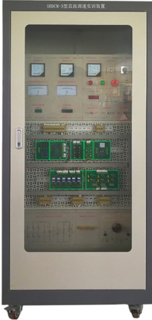 控制柜设有玻璃门、直观清晰。最上部为示波器放置区。中间部分为控制模块安装区、电源控制及仪表区,仪表装有交直流电压表、交直流电流表和数字转速表(可显示0~9999r/min,实时数字显示电机转速,同时输出模拟量电压信号);下部为变流功率模块、三相同步变压器、三相电流互感器及可调电阻负载等。