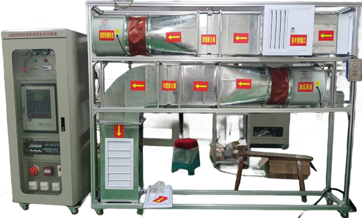 防烟排烟系统实训装置由模拟房间配备系统和排烟风机系统组成(主要由风口、风阀、排烟窗和排烟风机、排烟防火阀、送风机、送风风道以及排烟风道和相关的火灾探测器、联动控制系统组成。