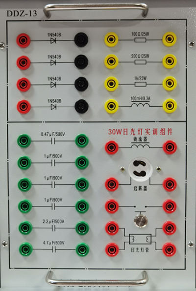 提供0.22uF/500V、0.47uF/500V、1uF/500V(三只)、2.2uF/500V、4.7uF/500V高压电容、镇流器、启辉器、日光灯等,高压电容可通过钮子开关控制,完成日光灯电路连接和功率因数提高实验。