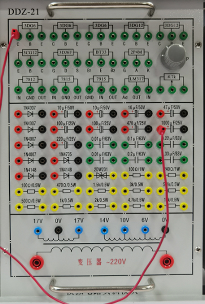 提供低压交流电源(0V、6V、10V、14V抽头各一路及中心抽头17V两路)、三极管(3DG6、3DG12、3CG12)、二极管(1N4007、1N4148)、稳压块(7812、7815、7915、LM317)、电阻、单结晶体管、蜂鸣器、电容等。配有相关实验元器件。