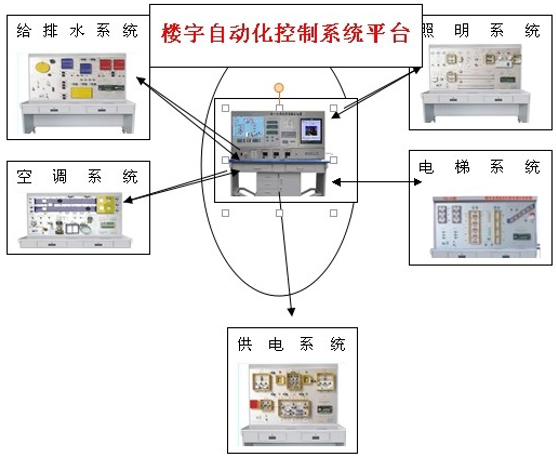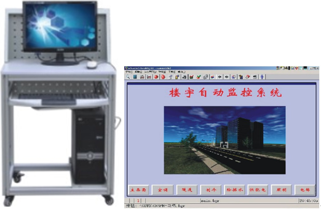 楼宇自控中央计算机管理中心,本系统全部器件均采用实物,整个实训装置主要由网卡、组态软件、配置软件、控制软件系统等组成。