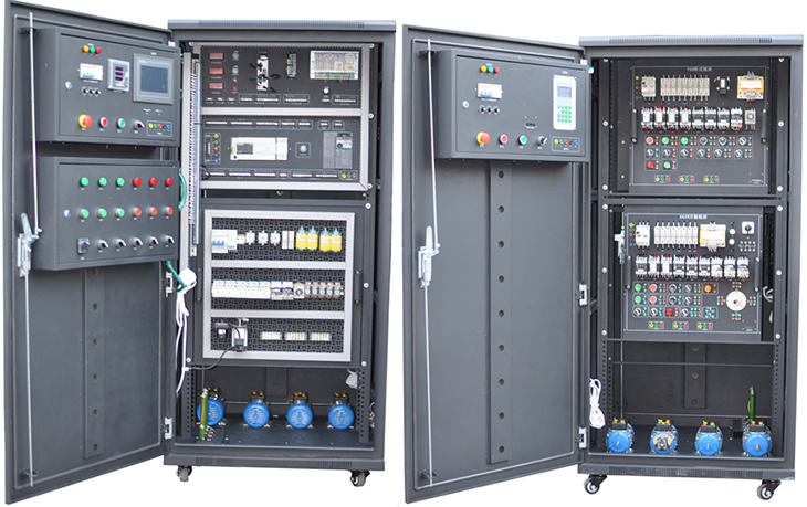 电工实训考核装置装置可完成"电工技术"、"工厂电气控制"、"机床线路控制"、"可编程控制技术"等多门课程的实训。装置资源开放,可充分培养学生的实际动手能力,适合当今教育教学中的实训训练。本装置采用用标准配电柜为主体柜、双面结构,包含如下资源:电源控制、三相交流电源,直流电源,励磁电源、电枢电源、测量仪表、可编程控制器(三菱系列)、模拟量模块、编码器、彩色触摸屏、变频器(三菱系列)、控制软件、交流接触器、按钮、指示灯、时间继电器、行程开关、中间继电器、三相异步电机、直流电机,机床智能考核等。适用于大学、专科院校及各类职业教育培训机构的实训教学、考核鉴定。