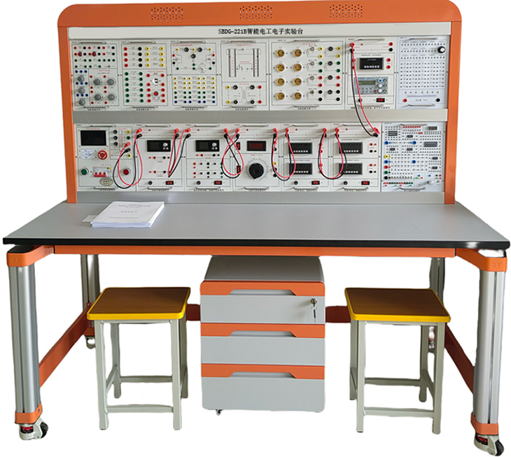四、智能电工电子实验台主要配置及功能:实验平台由实验桌、实验台架、存储柜、实验挂箱组件、配件等组成。