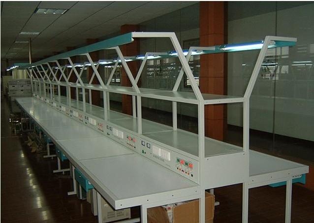 实训台上提供日光灯(用于照明)2个,透明的PVC板4个,可夹放原理图等资料,另外还配备三芯双联暗插座4个、两芯暗插座2个、工具柜2个,工作台面设有绿色防静电桌垫,整个装配线安全可靠。