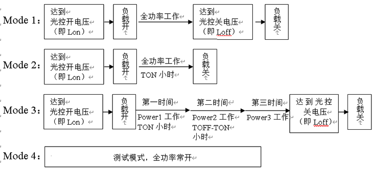 Ø 普通充放电工作模式、光控开/关、光控开/时控关工作模式