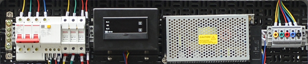 组成:三相四线漏电保护开关、380V指示仪表、开关电源、即插即用端子、双层端子、保险丝端子,导轨;