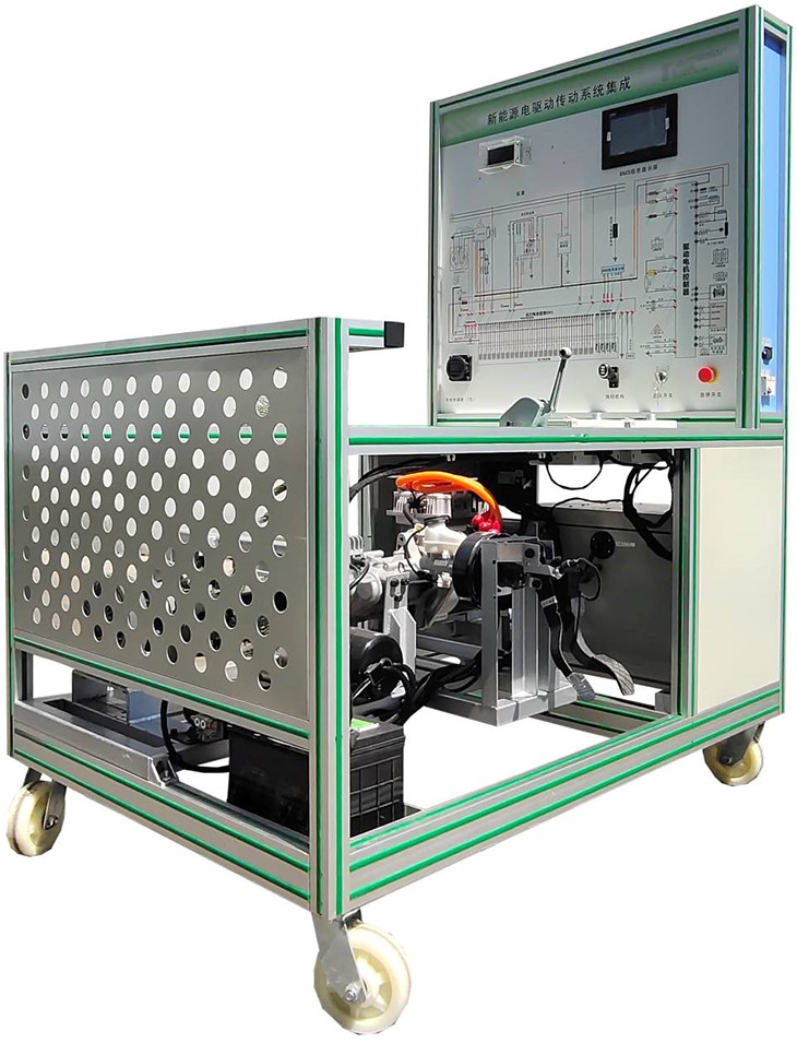 磷酸铁锂动力电池包及管理系统(带CAN通讯,含24单体电池,放电继电器,充电继电器,预充继电器,预充电阻,霍尔电流传感器,维修开关,保险,充电接口,放电接口,低压控制接口,动力电池采集模块,BMS电池管理系统主控模块,7寸液晶显示屏)、驱动电机及运行部分、电子油门总成、换挡机构总成、仪表(带CAN通讯)、变速箱、左右传动轴、左右前轮碟刹、磁粉制动器(左右)、手动张力控制器,助力器带泵总成,真空泵总成、电动真空助力刹车系统、真空压力传感器、真空罐总成、国标充电插口与充电枪、车载充电机(带CAN通讯)、DC-DC模块、故障设置系统、辅助蓄电池(12V45AH)、蓄电池断电开关、急停开关、上位机软件及数据线(电机与电池控制单元)、一体化全铝合金型材搭建的移动台架(1500×1000×1700mm ,带自锁脚轮装置,带安装检测端子的原理面板948×898mm)、故障考核系统、设备操作说明书。