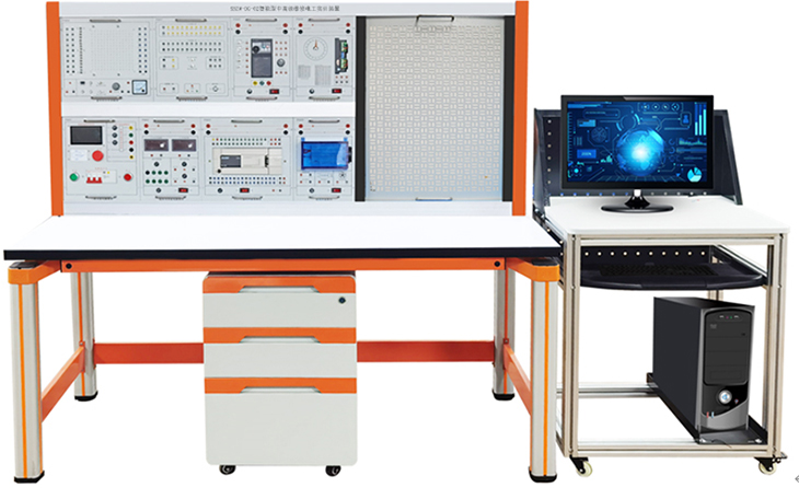 本实训台由实训挂件、实训桌、实训储物柜三大部分组成。