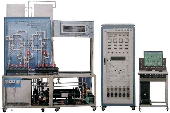 空气调节系统由、模拟房间、风机盘管、中央空调控制器、阀门,一台水泵、不锈钢换热器组等组成,主要完成空气调节作用。(室内送风风机转速可调),主要完成制冷机组冷却热交换,为室内提供适当的温度