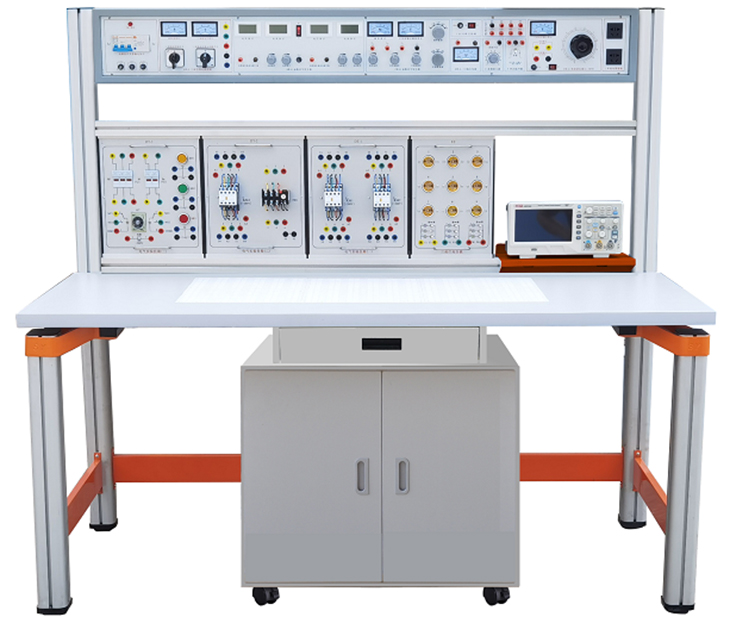 装置由实训主机箱、磁吸式实训基座、实验桌、电气控制实训挂箱、挂箱支架、移动矮柜、示波器架、磁吸式透明创新实验模块(所有磁吸式透明创新实训模块储存在特制的磁吸式底板上,便于管理)、学生凳等组成。实训装置支架与实训桌可组合、可拆装。