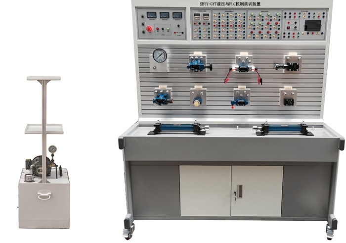 液压与PLC控制液压实训装置是我公司根据高校机电一体化对电、液控制的教学大纲要求,我公司液压与PLC控制液压实训设备的优点,采用了开放型实训台结构,广泛征求专家教授与老师的意见,经不断创新改进研制而成的。集真实的液压元件、各执行模块、继电器控制单元、PLC编程控制技术于一体,液压元件成独立模块,液压元件均装有带弹性插脚的过度底板(航天铝型材),实训时可在通用铝型材板上组装成各种液压系统回路,电机和泵轴承式连接(一体化)再和油箱固定在一起,油箱和控制屏单独放置;带有三相电源漏电保护,直流电源带有过流保护,系统额定压力为6.3Mpa。