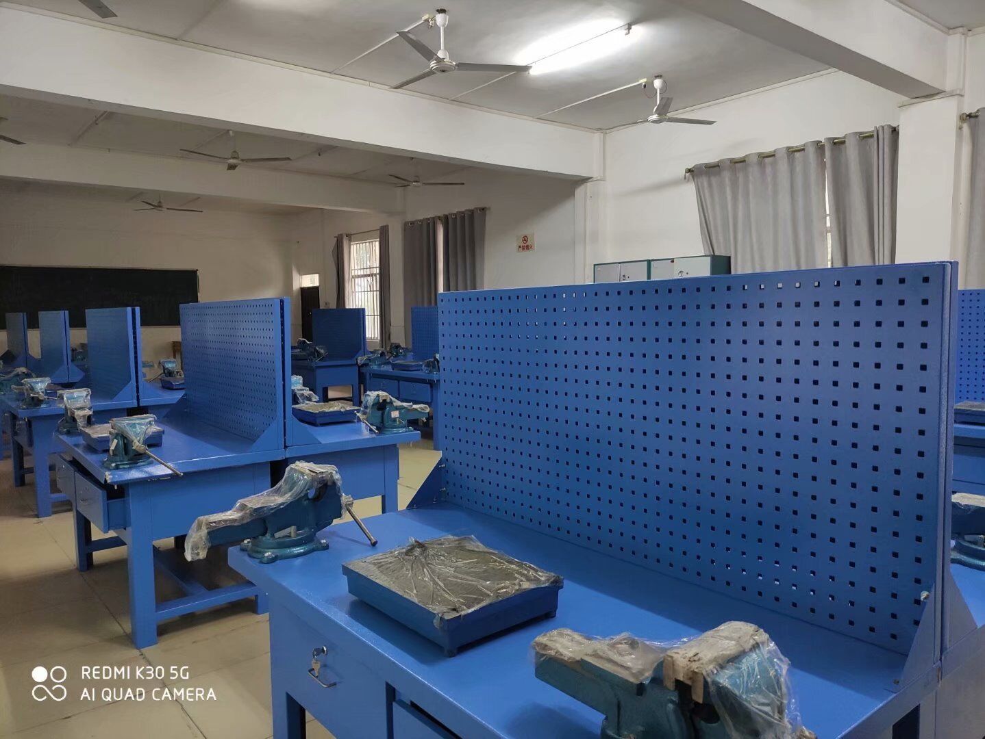 ④钳工工具材料、劳保用品准备室:工具材料货架、各型号工具分类塑料盒、钳工工量夹具及备配件、钳工实习板料及棒料、配套设备的维保配件、劳保用品、办公桌等。