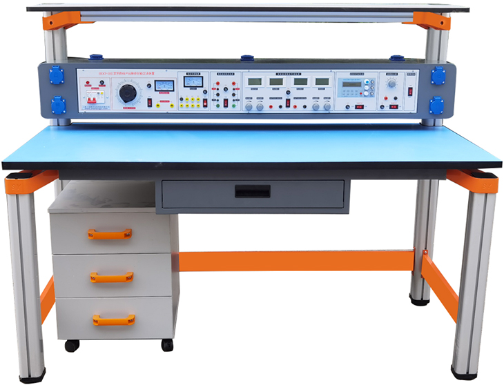 实验桌规格为1500mm(长)*700mm(宽)*1150mm(高),设有一个抽屉。实验桌主体结构全部采用高性能表面氧化的铝型材及一次成型铝压铸框架连接构件,连接构件采用压铸成型工艺(非焊接工艺),经机加工、抛丸、喷砂,表面静电喷涂工艺,安装方便、快捷,用户可自行DIY组装。桌体立柱采用工业铝型材成型工艺,表面氧化处理,截面尺寸:70mm×70mm,四面带槽,槽宽约8mm,端部装有注塑成型配套塑料堵头。桌面采用25mmE1级三聚氰胺饰面板,桌面板下设支撑框架,承受力不少于300kg。配备储存柜,存放元件及工具,储存柜底部4只高强度万向可制动PU脚轮,方便移动。实训装置整体简约不简单,高端大气,符合现代化产品审美和发展趋势。
