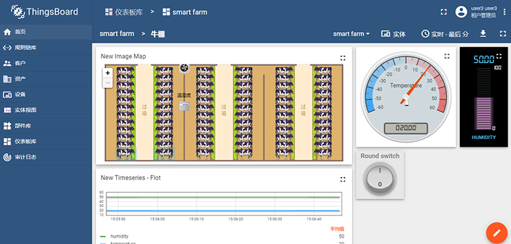 图:智慧温室课程案例,使用ThingsBoard云平台的仪表板,对感知层设备上送的温室环境数据与设备状态进行展示。