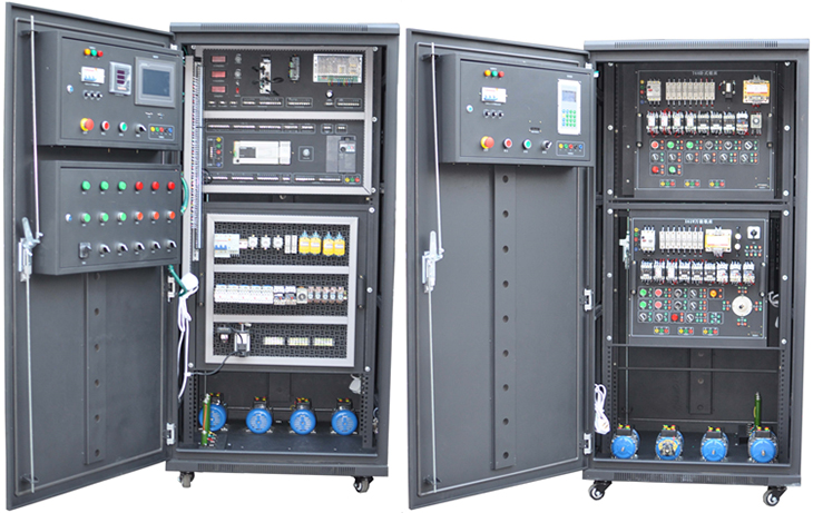 现代电气控制竞技装调考核实训装置、现代电气综合实训设备可完成"电工技术"、"工厂电气控制"、"机床线路控制"、"可编程控制技术"等多门课程的实训。装置资源开放,可充分培养学生的实际动手能力,适合当今教育教学中的实训训练。本装置采用用标准配电柜为主体柜、双面结构,包含如下资源:电源控制、三相交流电源,直流电源,励磁电源、电枢电源、测量仪表、可编程控制器(三菱系列)、模拟量模块、编码器、彩色触摸屏、变频器(三菱系列)、控制软件、交流接触器、按钮、指示灯、时间继电器、行程开关、中间继电器、三相异步电机、直流电机,机床智能考核等。适用于大学、专科院校及各类职业教育培训机构的实训教学、考核鉴定。