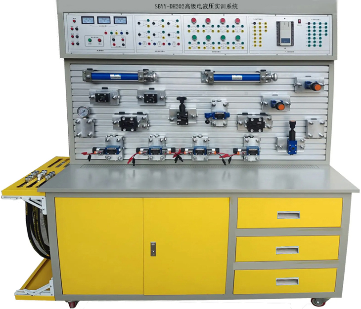 高级电液压实训系统、液压实训系统是以高等院校《液压传动》的实验教学大纲为指导,参考广大师生的建议,结合职业培训及专业进修对流体传动的要求而精心设计研发的。本实训系统配置了各种液压控制阀和液压缸等液压元件及相关工具,通过说明书学习理论知识并观察液压元件的外形特点,加深学生对液压元件结构及工作原理的理解,在此基础上安装、调试整个液压传动系统。该实训系统采用敞开式结构的操作板,各种液压元件可灵活安装于操作板上,元件间用液压软管连接,液压软管的快换接头可使训练实验即快速又安全的进行。该系统除了可以进行常规的液压基本控制回路实验外,还可进行液压控制技术应用实验、液压技术课程设计,以及可编程控制器(PLC)学习及其基本应用实验等,是机电完美结合的典型实验设备。