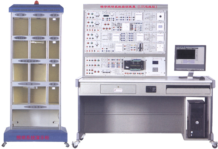 照明演示柜为楼宇照明控制部分的演示对象,仿实物化设计,属于半实物。采用分层结构,能模拟楼层整体照明效果,实物模式,分为五层结构,分别是体现多种照明场景。照明场景,可模拟9种场所:航空,卧室,客厅,经理办公室,员工办公室,多功能会议厅,大堂,地下停车场和楼道,其中多功能会议厅具有8种情景。整个照明演示系统分别设有频闪灯、白炽、荧光灯、筒灯和光字牌,能真实模拟各场所对照明控制以及照明效果的要求。