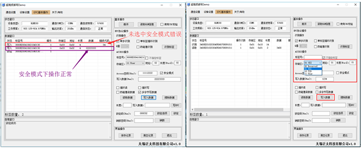 单卡及多卡EPC识别:单步识别、单标签循环识别、防碰撞识别; 单卡及多卡TID识别实验:标签识别号; 标签UII块区读写操作:指定UII读写、不指定UII读写、多字节写 GEN2标签的USER多字节数据读写 GEN2标签的安全操作 GEN2标签的锁定操作 |
