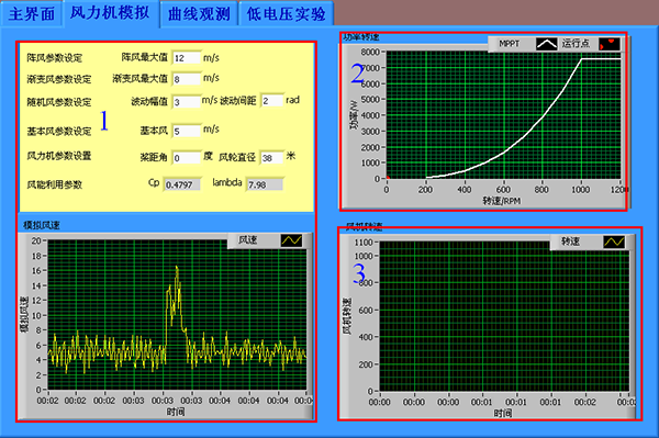模拟真实风力发电机的启动、并网、正常运行和停机过程,具备模拟机组变速调节能力,有功、无功的调节能力;
