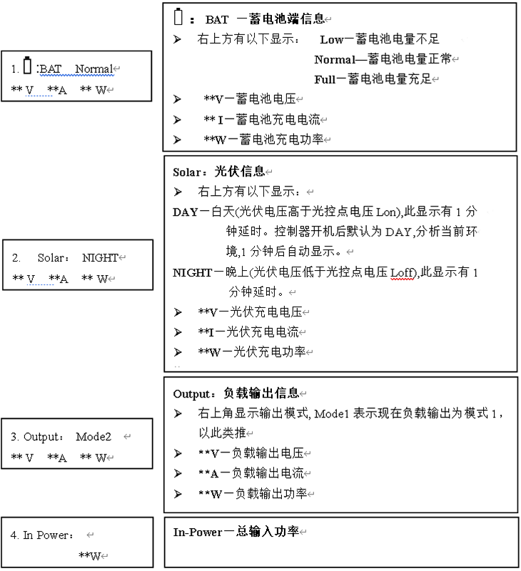 ⑥显示光伏发电系统的 各种工作状态,包括:蓄电池(组)电压、负载状态、电池方阵工作状态、辅助电源状态、 环境温度状态、故障报警等。