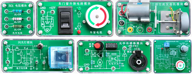 汽车电工电子实训模块由透明封闭元件盒及PCB板构成。元件盒体由透明有机工程塑料注塑而成,具有示教功能,使用者能够观察到元件形状和接线方式,有利于教师讲解和学生认识;面板采用PCB制作而成,表面清爽、符号线路清晰、元件更换容易。