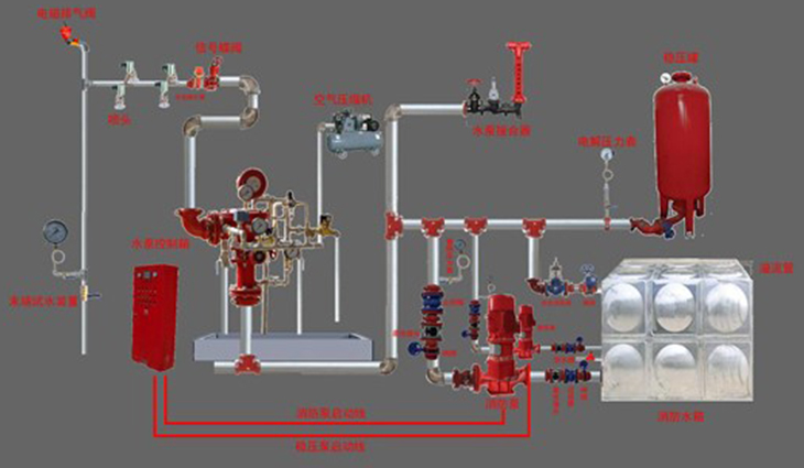 非工作状态下,系统在雨淋阀之后的管道内,有不充气和充满低压气体两种情况,火灾发生时,安装在保护区的感温、感烟火灾探测器首先发出火警信号,控制器在将报警信号作声光显示的同时开启雨淋阀,使水进入管路,并在很短时间内完成充水过程,使系统转变成湿式系统,以后的动作与湿式系统相同。