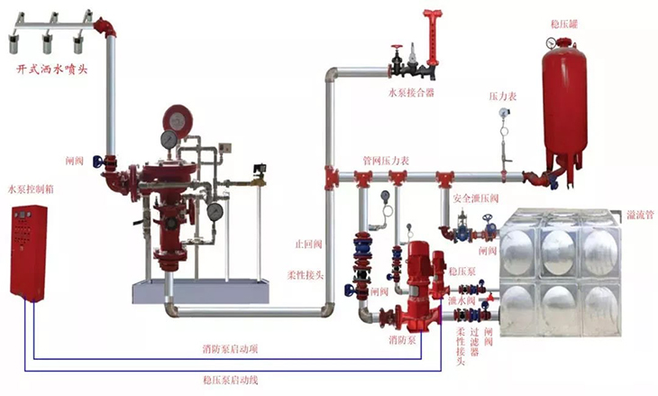 由闭式洒水喷头、水流指示器、预作用报警阀组以及管道和供水设施等组成,准工作状态时配水管道内不充水,由火灾自动报警系统自动开启雨淋报警阀后,转换成为湿式系统的闭式系统。