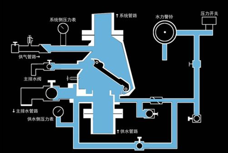 当系统处于伺应状态时,座圈上的沟槽小孔被阀瓣盖住封闭,通往水力警铃的报警水道被堵死;当上、下压力差达到一定数值,阀瓣才开启(差压启动),水就从供水侧流向系统侧,警铃报警,灭水系统喷水;当上、下压力频繁开启,在阀瓣上设有小补水阀,当系统侧管网有微小渗漏或水源压力有波动时,可以通过补水阀给管网补水,平衡上、下腔压力,稳定了阀瓣,从而避免了误报警。
