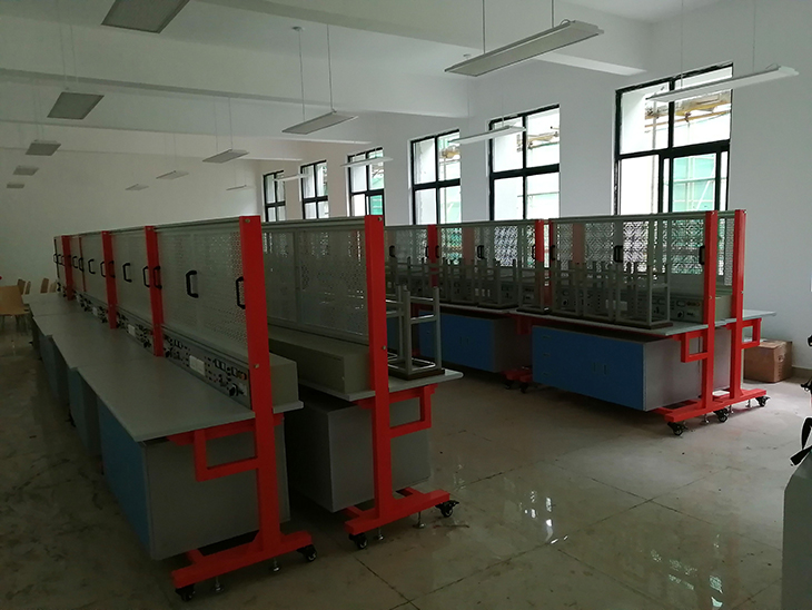 2、实训桌桌面采用25mm麻灰色高密度层压板封边特制,有效提高绝缘等级;实验桌底部装有至少4个导向轮,方便实训台架移动;