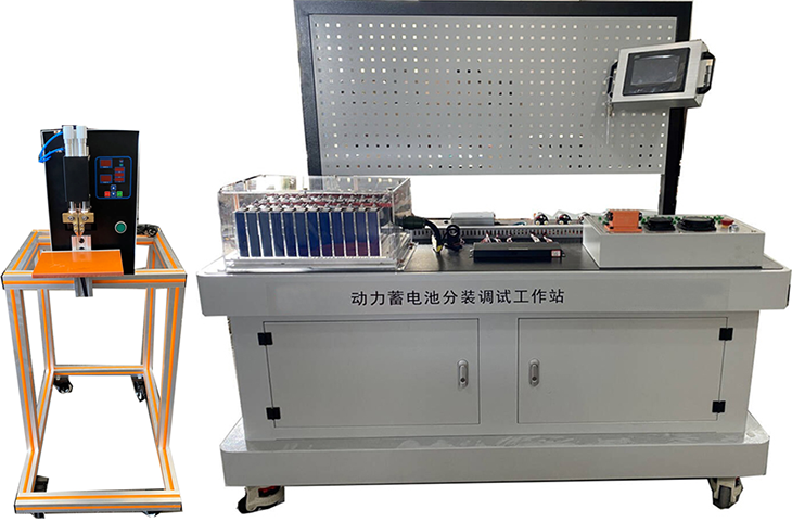 动力蓄电池分装调试工作站台面分别设计有不同的功能区域,包括电池焊接工作区、动力蓄电池分装调试工作区、动力蓄电池通电调试区。