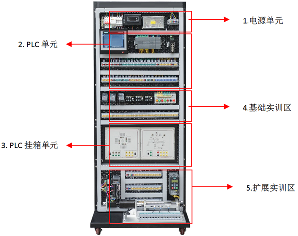 实训单元组成:网孔板实训区主要由电源单元、PLC单元、PLC学习箱单元、基础实训单元、小车运动单元、变频器单元等组成。