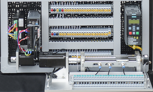 S7-1500实训装置平台、工作台以网孔架为基础实训单元,仿真企业真实环境,可开展PLC系统基础模块连接实训。该工作台采用单面实训方式,实训区主要由电源单元、PLC单元、PLC学习箱单元、基础实训单元、扩展实训区(伺服控制小车运动实训单元、步进电机单元和变频器单元)六大部分组成。