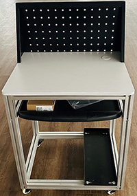 3、电脑桌:钢铝结构,装有4只万向轮,装有黑色钢质网孔电脑后靠、键盘托、主机支架。
