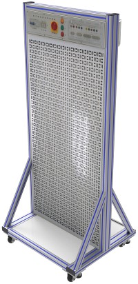 3. 平台采用立式结构开放式设计,主体采用40*80型材做骨架,周边采用Q235冷扎钢板做封板,表面静电喷塑处理,整机既坚固耐用,又美观大方。底部装有带脚垫万向轮,万向轮移动时用,可调脚固定时用,移动固定两相宜。顶部安装电源模块,中部为实训区域,依据任务安装不同挂板。