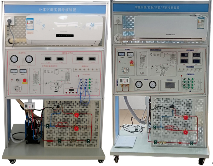 智能空调控制实验实训考核装置是为大中专院校的制冷空调专业、各技能培训及全国职业技能鉴定部门开发设计的,适用于"制冷原理及应用"、"制冷空调技术"、"制冷空调设备维修与操作"等教学实训要求。该装置集制冷系统、电气控制系统、故障模拟系统为一体,布局合理、造型美观大方。